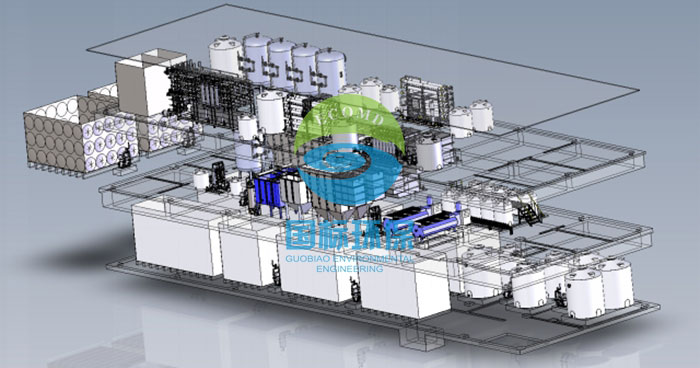 此項目包括含鉻廢水、含氰廢水、含氟廢水、含油廢水、熒光廢水、地面廢水、酸堿綜合廢水等多類廢水。設計處理總水量90m3/h,污水處理采用“化學與處理+混凝沉淀+過濾”工藝;純水制備采用“過濾+一級反滲透+EDI”工藝。處理后達到《電鍍污染物綜合排放標準》GB21900-2008表2標準,污水回用率≮65%,回用水質(zhì)達到航標C類水標準。