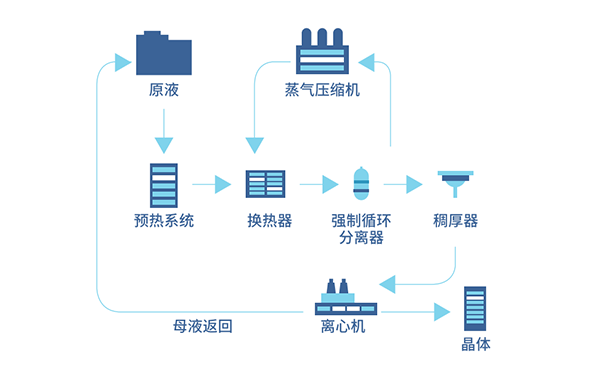 MVR原理是利用蒸汽壓縮機(jī)壓縮蒸發(fā)產(chǎn)生的二次蒸汽,提高二次蒸汽熱量和溫度,壓縮后的蒸汽打入蒸發(fā)器作為熱源,再次使其原液產(chǎn)生蒸發(fā),從而達(dá)到不需要外部鮮蒸汽,依靠蒸發(fā)器系統(tǒng)自循環(huán)來(lái)達(dá)到蒸發(fā)濃縮的目的。比傳統(tǒng)蒸發(fā)器節(jié)省70%左右的能源,節(jié)省80%以上的冷凝水,減少50%以上的占地面積。