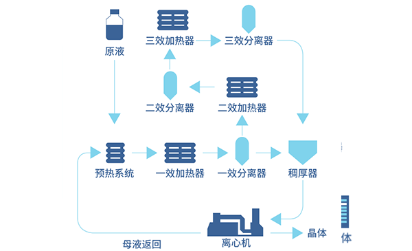 在多效蒸發(fā)裝置中,由新蒸汽加熱第一效產(chǎn)生的蒸汽作為第二效的加熱介質(zhì)得以再次利用。這樣可以將新蒸汽消耗有效降低約50%。重復(fù)利用此原理,可進(jìn)一步降低新蒸汽消耗。最后一效的二次蒸汽進(jìn)入冷凝器,用水冷卻冷凝成水而移除。
