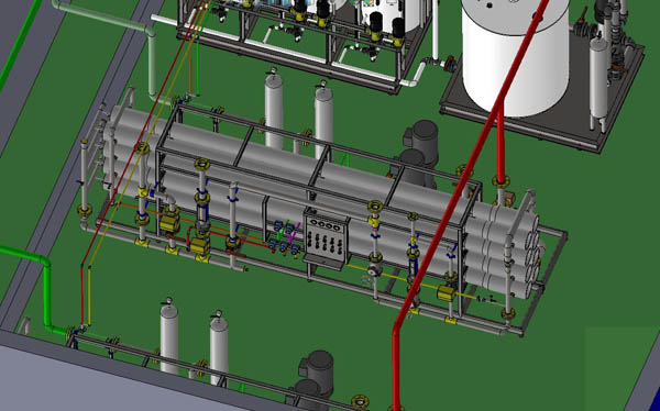 本項目設計總產(chǎn)水量50 m3/h(處理系統(tǒng)采用平行的兩套系統(tǒng),加藥及控制系統(tǒng)一套),產(chǎn)水率不低于65%。新增回用水深度處理系統(tǒng),選用低壓反滲透設備,對MBR池出水進行深度處理。系統(tǒng)采用保安過濾器-反滲透系統(tǒng)。從回用水箱取水,通過反滲透系統(tǒng)后,濃水通過總排放口進行排放,反滲透出水端流入本項目內(nèi)新增的100m3不銹鋼產(chǎn)水箱及配套水泵到使用點,進水和出水分別與回用水箱和聯(lián)合站房水池水位聯(lián)動。