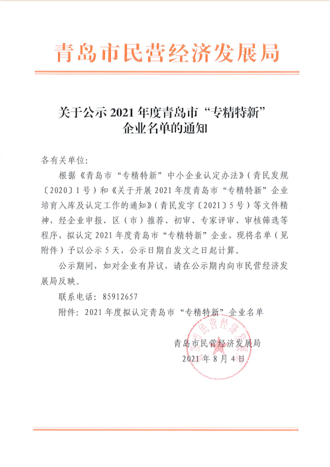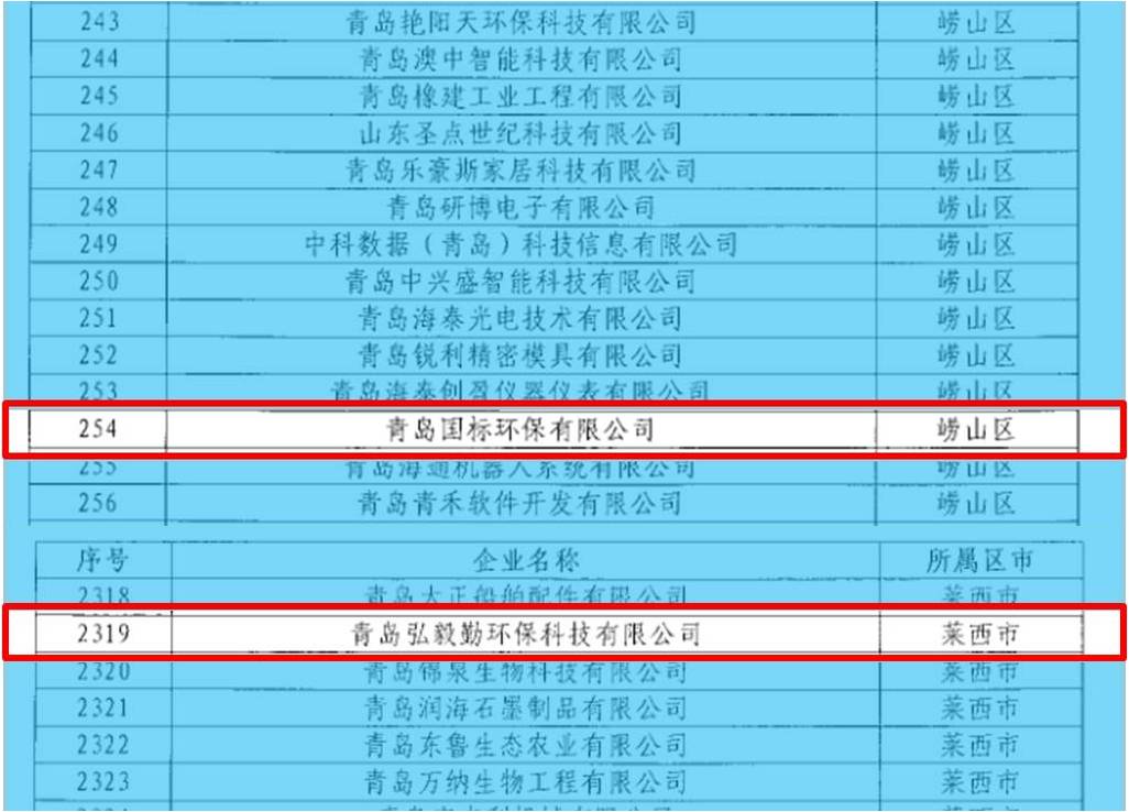 根據《青島市“專精特新”中小企業(yè)認定辦法》(青民發(fā)規(guī)【2020】1號)和《關于開展2021年度青島市“專精特新”企業(yè)培育入庫及認定工作的通知》(青民發(fā)字【2021】5號)等文件精神,經企業(yè)申報、區(qū)(市)推薦、初審、專家評審、審核篩選等程序,青島國標環(huán)保有限公司和國標子公司-青島弘毅勤環(huán)??萍加邢薰就瑫r被認定2021年度青島市“專精特新企業(yè)”。